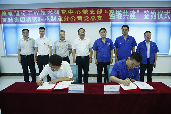 為深入貫徹落實哈電集團(tuán)“三級書記抓質(zhì)量”工作要求,深入開展“強黨性 精技術(shù) 提質(zhì)量 優(yōu)服務(wù)”主題黨日系列活動,積極向供應(yīng)鏈延伸加大黨建共建力度,以黨建引領(lǐng)促進(jìn)技術(shù)水平和產(chǎn)品質(zhì)量提升,近日,哈電集團(tuán)佳電股份工程技術(shù)研究中心黨支部與瓦房店軸承集團(tuán)精密軸承制造分公司黨總支開展以“強鏈共建”為主題的聯(lián)建共建活動。并簽訂黨建共建協(xié)議。佳電股份黨委副書記劉漢成、瓦軸集團(tuán)黨委副書記孫世成出席簽約儀式。瓦軸集團(tuán)代表在公司領(lǐng)導(dǎo)陪同下參觀了企業(yè)展廳和生產(chǎn)車間。