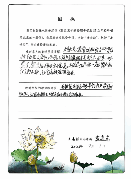 佳電股份將廉潔教育觸角延伸至“家庭”陣地,向近三年新提職干部、85后年輕干部及其家屬同步發(fā)放《家庭助廉倡議書》與《給年輕干部提個醒》廉潔讀本。倡議書中既有黨紀法規(guī)解讀,又含溫情寄語,旨在以家庭“小港灣”筑牢企業(yè)“大防線”。活動中,黨員干部與家屬共同研讀、深刻感悟,家屬們紛紛回信,字里行間滿是“廉潔齊家”的囑托與“慎終如始”的期許,讓清廉家風在企業(yè)中傳遞。