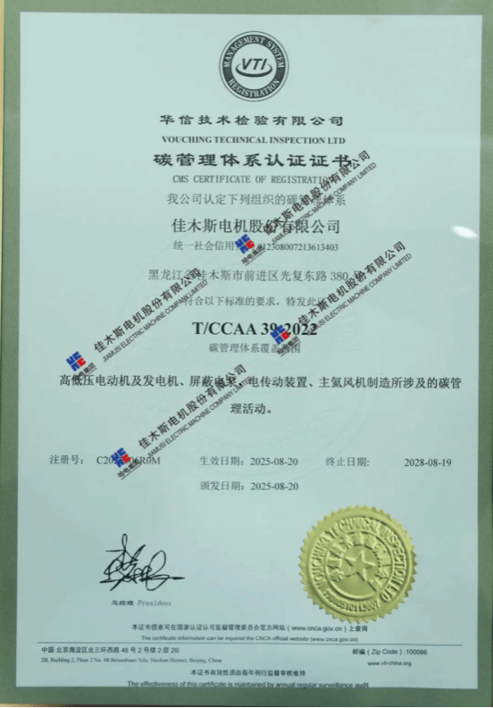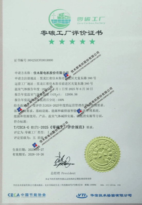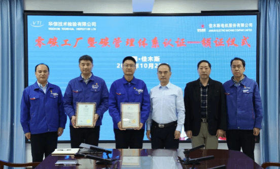 10月27日,華信技術(shù)檢驗(yàn)有限公司在哈電集團(tuán)佳木斯電機(jī)股份有限公司(以下簡(jiǎn)稱“佳電股份”)舉行零碳工廠暨碳管理體系認(rèn)證頒證儀式,佳電股份獲評(píng)《碳管理體系認(rèn)證證書》與《零碳工廠評(píng)價(jià)證書》,成為國(guó)內(nèi)電機(jī)行業(yè)首家通過(guò)《零碳工廠評(píng)價(jià)規(guī)范》新標(biāo)準(zhǔn)認(rèn)證的企業(yè),標(biāo)志著佳電股份在高端化、智能化、綠色化發(fā)展道路上邁出的關(guān)鍵一步。