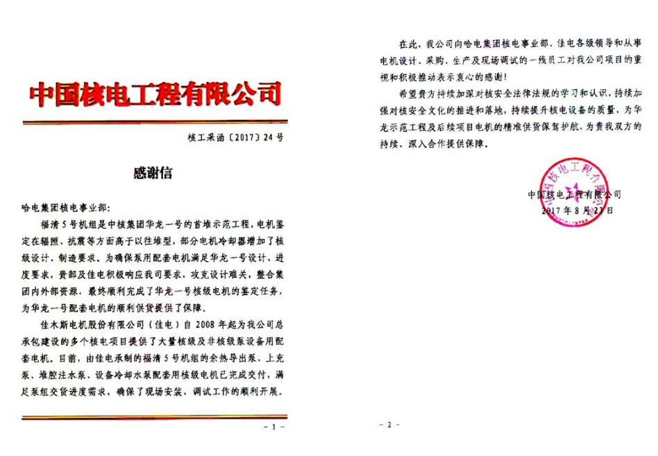 2021年1月30日,伴隨著全球第一臺(tái)“華龍一號(hào)”核電機(jī)組——中核集團(tuán)福建福清核電站5號(hào)機(jī)組投入商業(yè)運(yùn)行,標(biāo)志著我國(guó)三代核電技術(shù)領(lǐng)域躋身世界前列。 作為我國(guó)第一家取得國(guó)家核安全局頒發(fā)的1E級(jí)電機(jī)設(shè)計(jì)、制造許可證單位,...